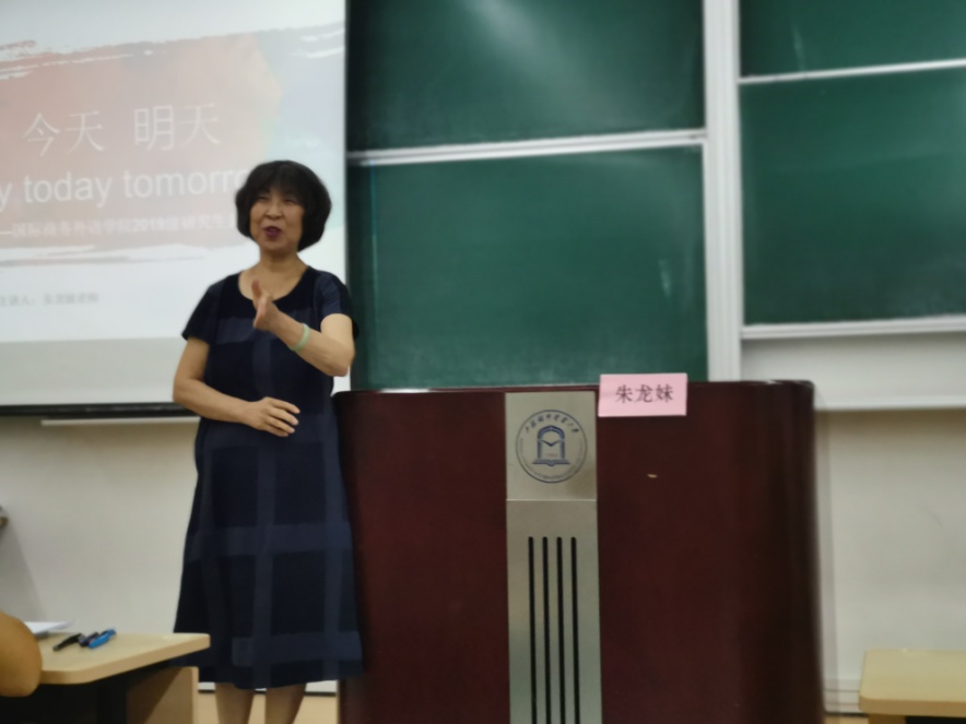 朱龍妹老師進行了一場以“昨天 今天 明天”為主題的講座,作為外語學院2019級研究生新生的第一課。朱老師介紹了學校的基本情況,也講述了她本人的教學工作經歷。在課堂上,朱老師熱情地和我們講述了有趣的故事、人生經驗、親切和同學們互動。