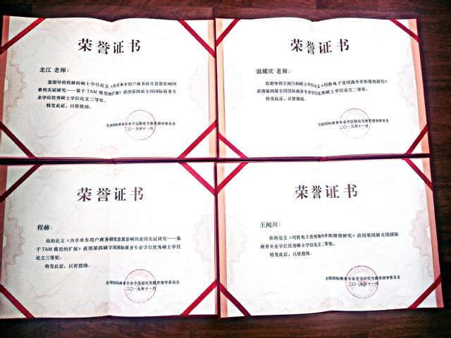 日前,第四屆全國國際商務專業碩士(2018年)優秀學位論文評選結果揭曉,我校國際商務專業碩士在評選中再創佳績。我校王閱川同學的《均勝電子連續海外并購績效研究》(指導老師:溫耀慶)榮獲二等獎;程赫同學的《共享單車用戶商務接受意愿影響因素的實證研究——基于TAM模型的擴展》(指導老師:龍江)榮獲三等獎。